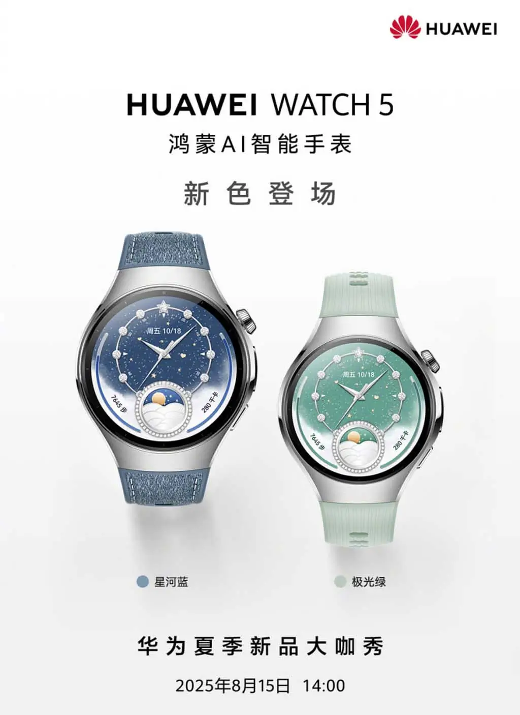 ファーウェイは、Watch の 2 つの印象的な新しいカラーバリエーションを正式に発表しました 5: ギャラクシーブルー そして オーロラグリーン. 同社はこれらの新モデルを正式に発表する予定です。 2025 夏の新商品イベント, 予定されている 2:00 午後. ぜひ手に入れたい方へ, 正式発売前にデバイスを予約できるようになりました.