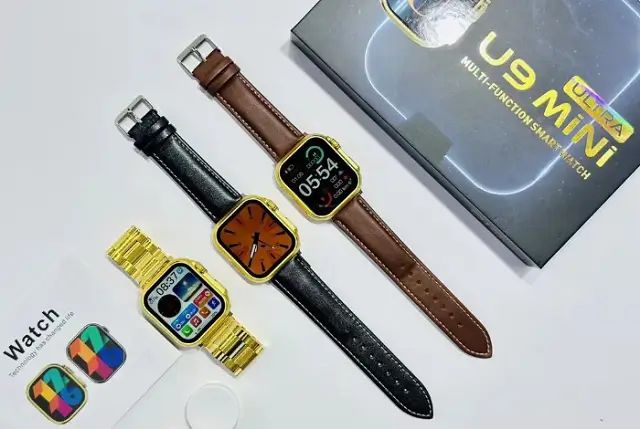 The U9 Mini smartwatch body is made of zinc alloy while the strap is available in silicone and alpine. Angående bildskärmen! This U9Mini Ultra smart watch has a 1.75-inch Large IPS touchscreen covered with 2.5D glass and is created with a resolution of 240*296 pixlar. This device is also packed with various watch faces and is available in gold and brown colors.